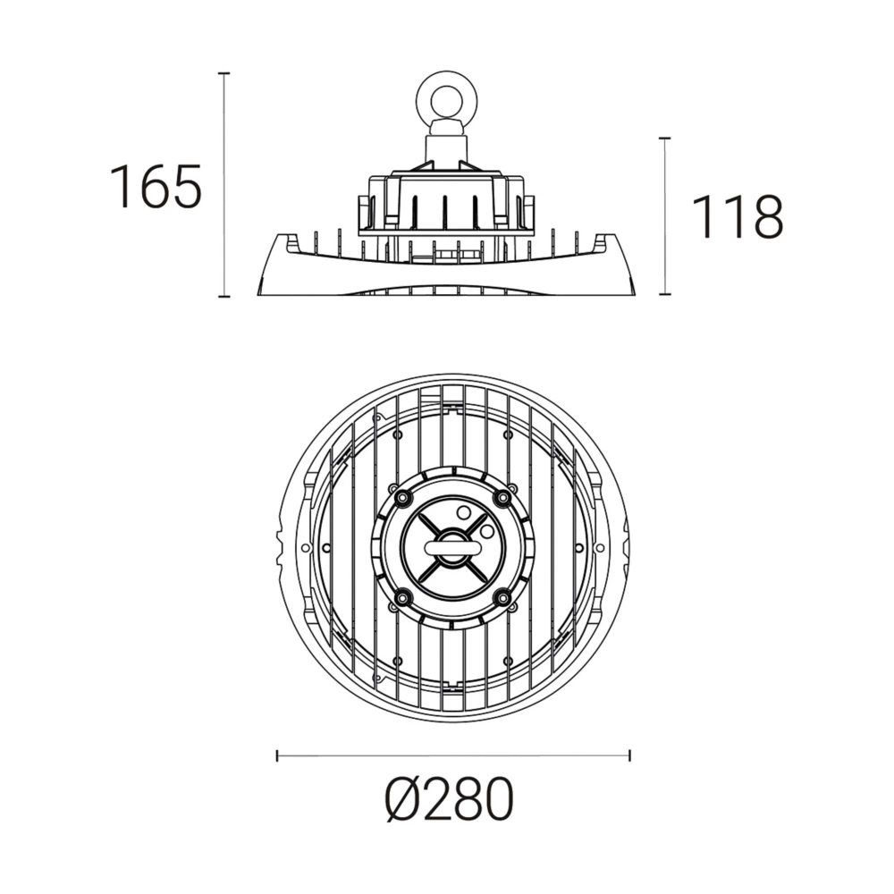 Robust, low profile LED high bay. Die-cast, powder-coated body and heatsink provide excellent thermal performance. Ideal for a range of installations including factories and warehouses. Suitable for drop rod, jack chain and catenary wire.
