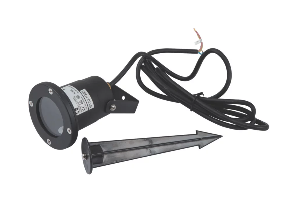 Multipurpose garden spotlight with powder coated die-cast aluminium body ensuring maximum endurance. Pre-wired with 2 metres of rubber insulated cable. Supplied with wall mounting bracket and spike.
