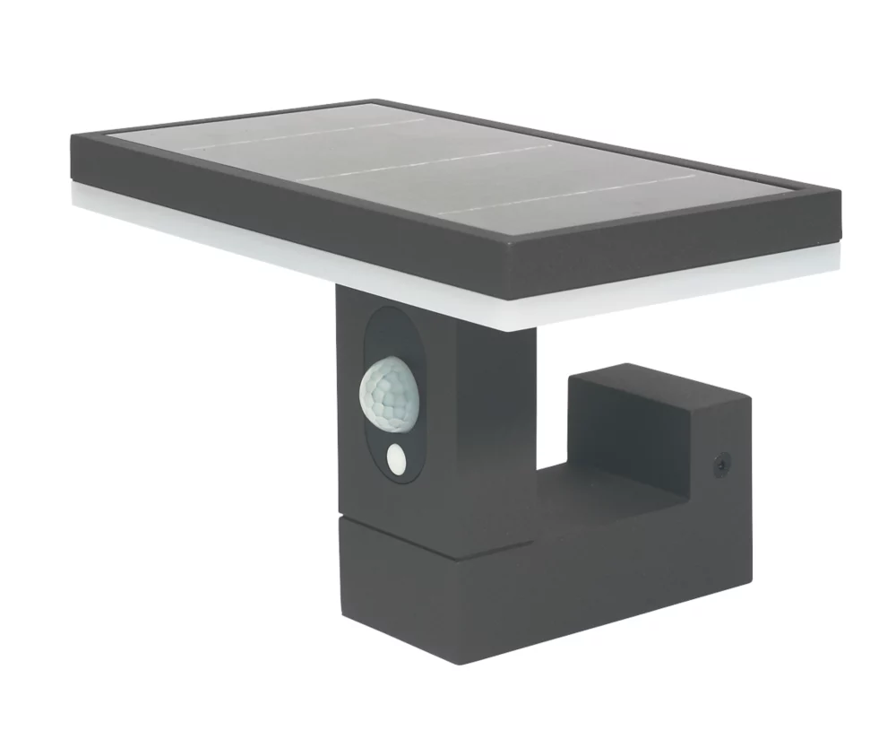 Rectangular solar-powered LED wall light suitable for domestic applications. Modern, die-cast aluminium construction with durable, textured powder-coat finish. Features 2 PIR motion sensor modes.