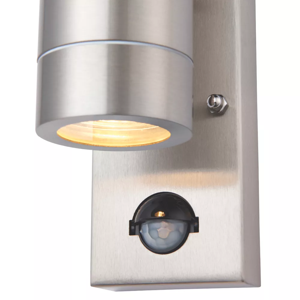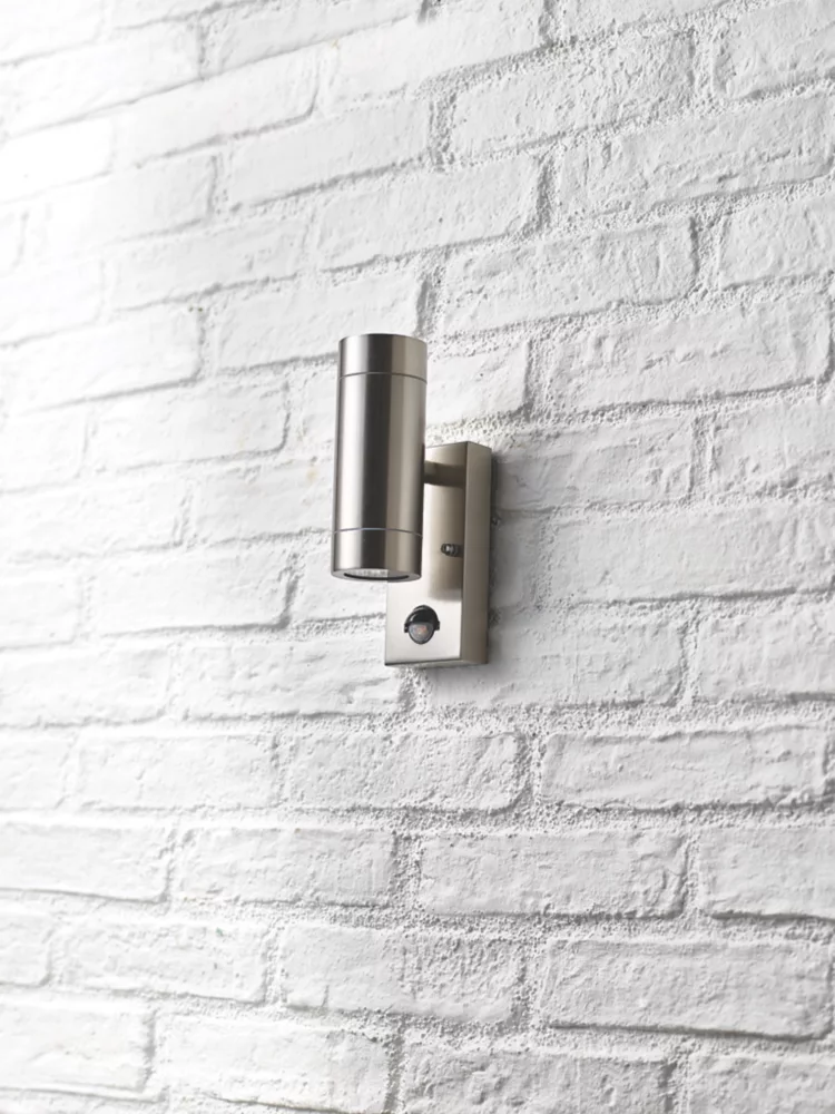 Stainless steel construction. Projects light both upwards and downwards and is fitted with a PIR sensor.