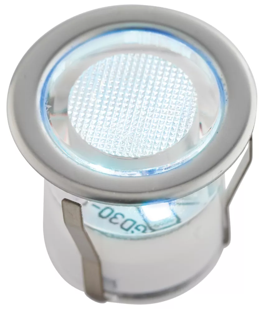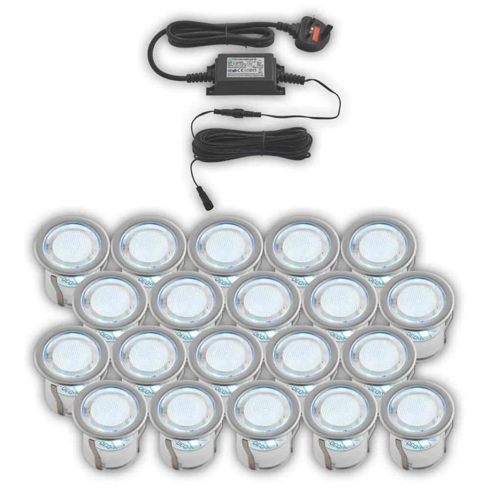 Metal and acrylic construction with brushed chrome finish. Fits 25mm hole. Adjustable legs ensure tight fit. The Coldstrip LED Deck Kit offers a sleek, contemporary, waterproof design, making this unit a must for decking, walkways and other outdoor areas. Combined with exceptionally low power consumption, this 20-head pack is enough to complement the largest of decks. Standard UK 3-pin plug fits into outdoor-rated mains sockets. Can be hard-wired into mains connection by removing plug. Easy to fit ‘plug and play’ connection system. 15m extension cable allows long distances to be reached.