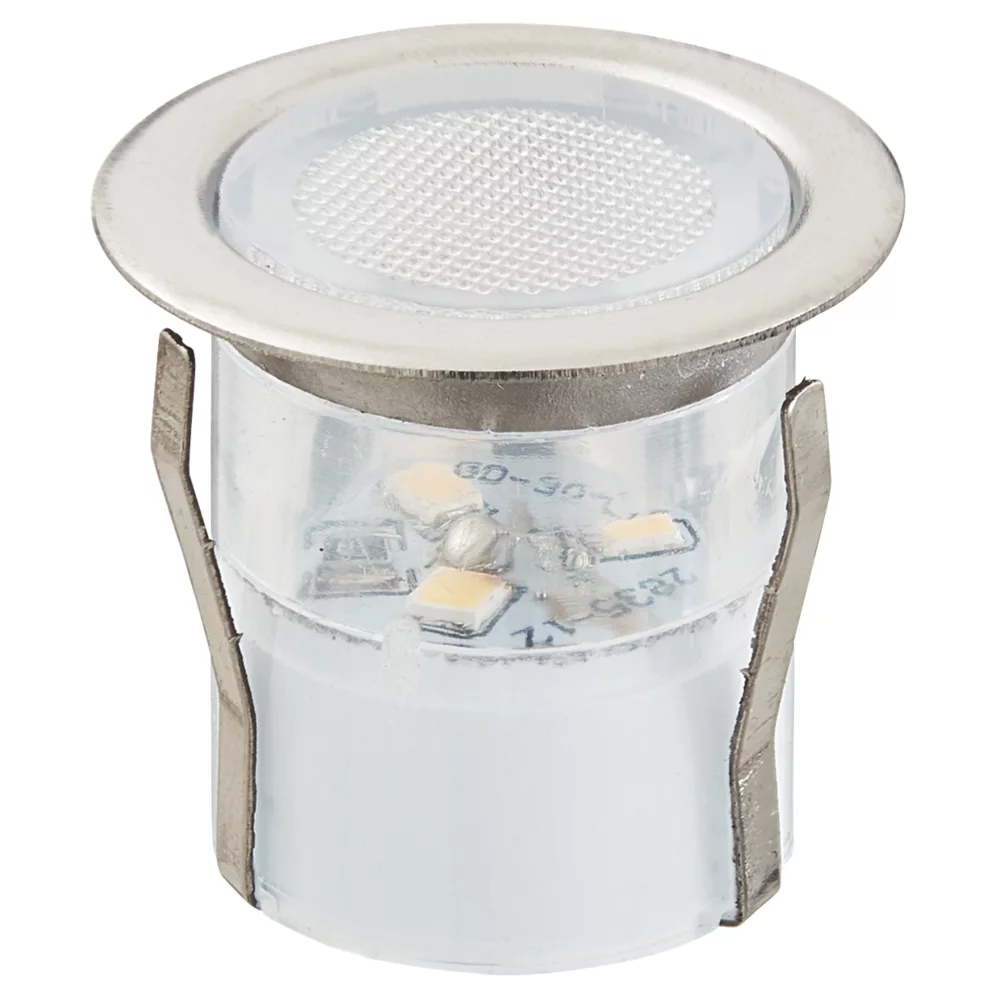 Metal and acrylic construction deck lights with brushed chrome finish and blue LEDs. Fits 25mm hole. Adjustable legs ensure a tight fit.