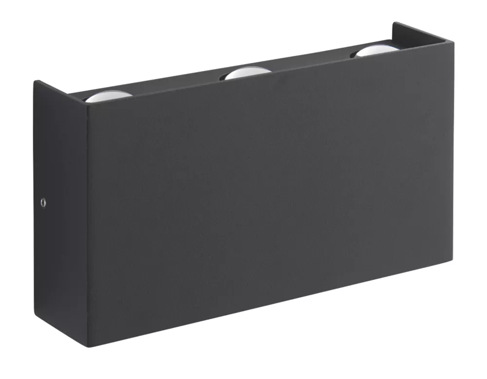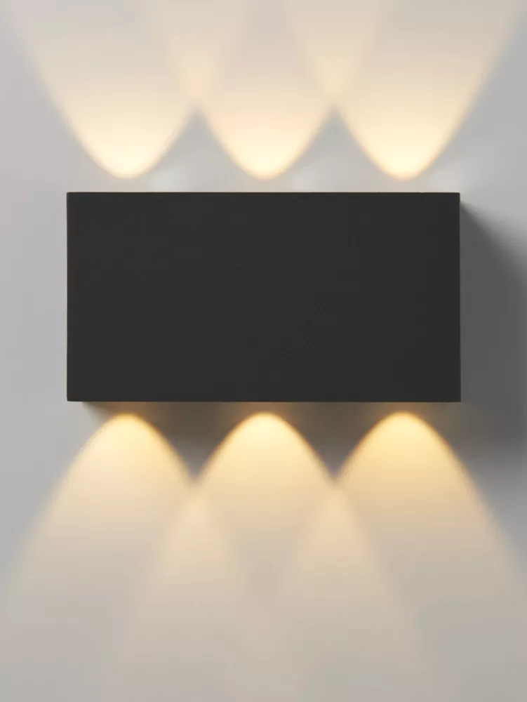 Die-cast aluminium alloy fitting with a textured black finish. Powerful LED modules project 6 x beams of light up and down the wall for a striking light effect. Sleek and compact design. Simple to install.