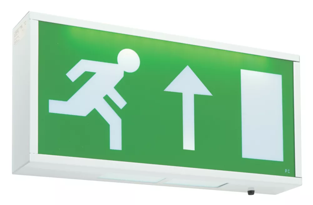 Steel and polycarbonate construction. Mains-powered fitting to provide illuminated directions to an emeergency exit.