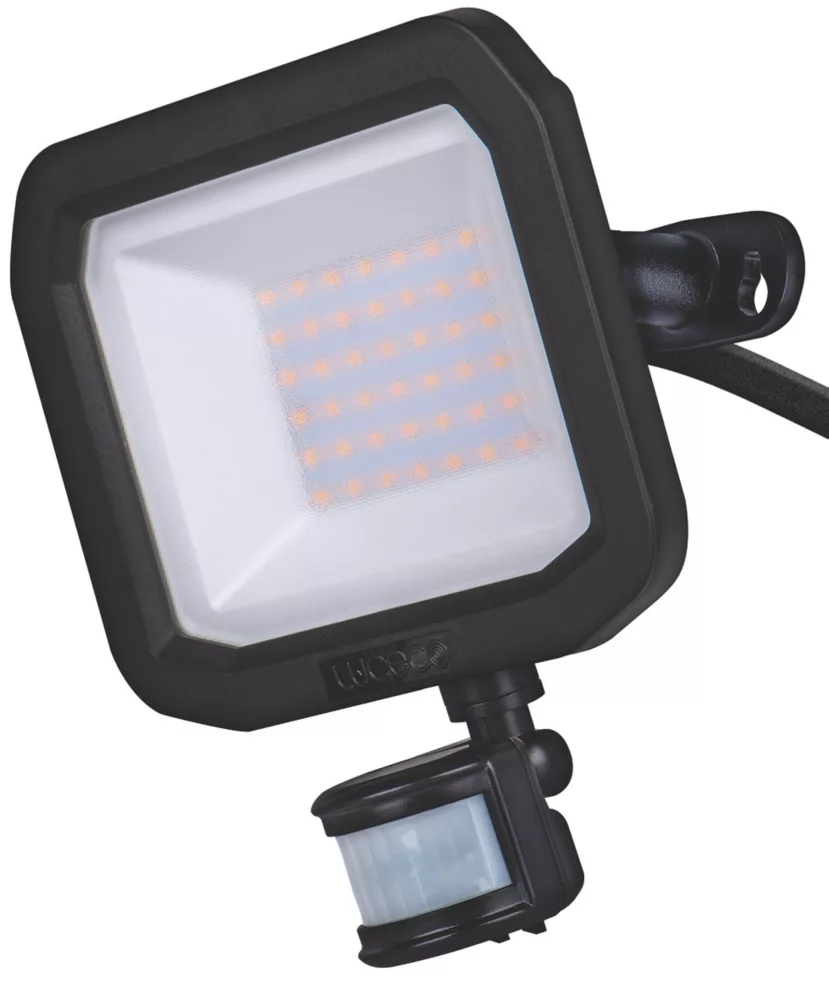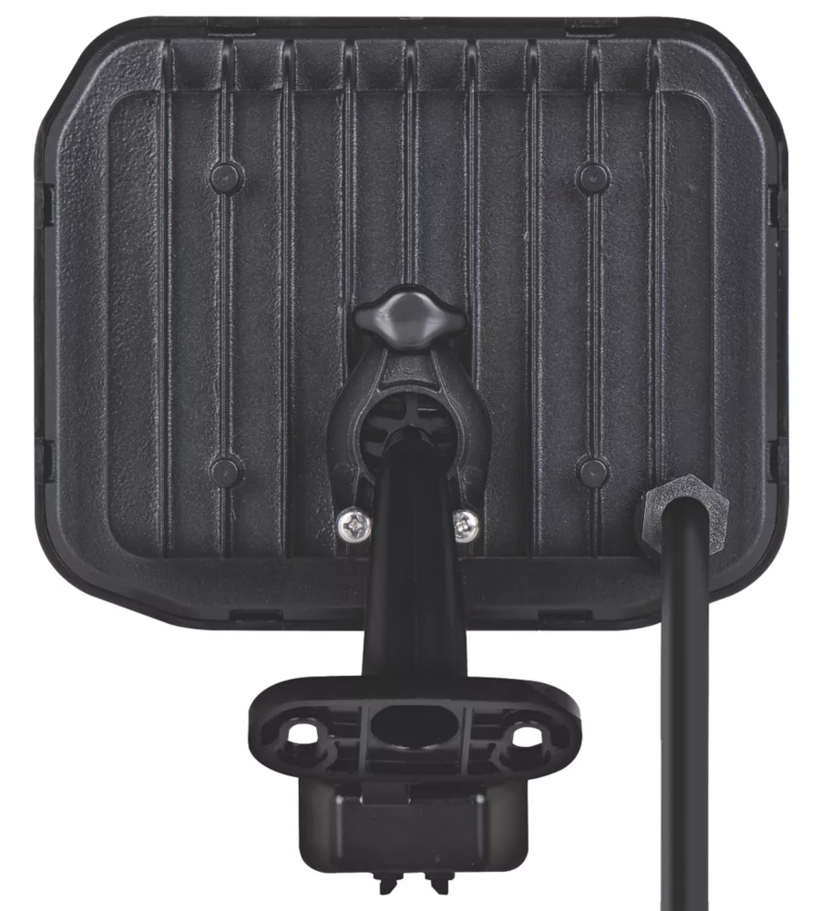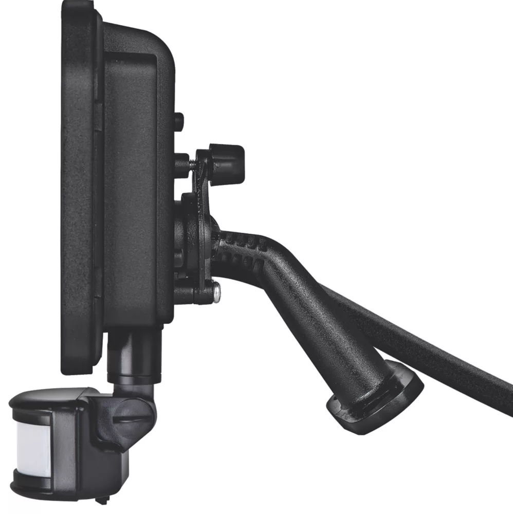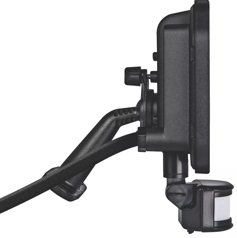 Aluminium and glass construction. Floodlight with swivel and tilt mounting arm with adjustable PIR. Pre-wired with a 1m rubber cable. Adjustable time and lux PIR with override function.