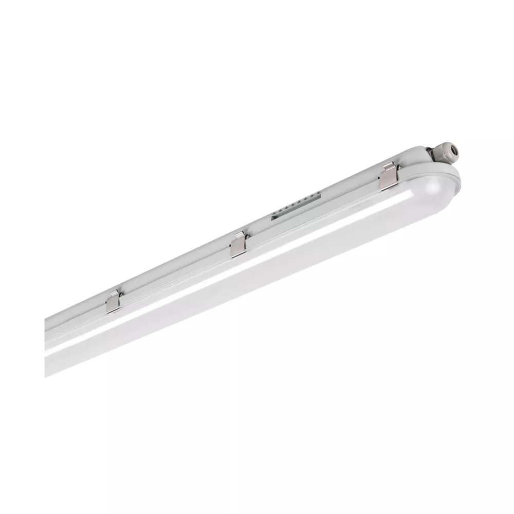 Polycarbonate body and diffuser with a low glare opal appearance. Ideal bright light solution for warehouses, garages and workshops. Easy and quick fit installation with the plug and play connected driver.