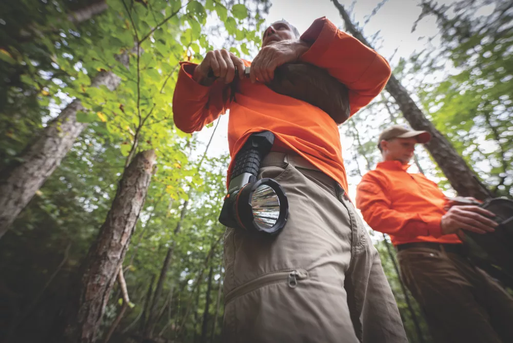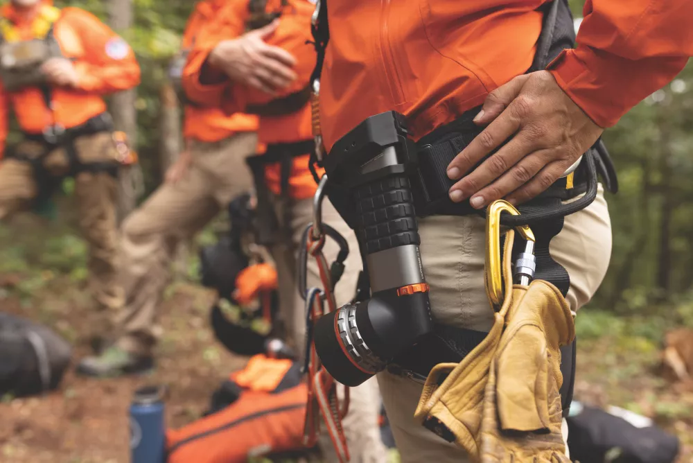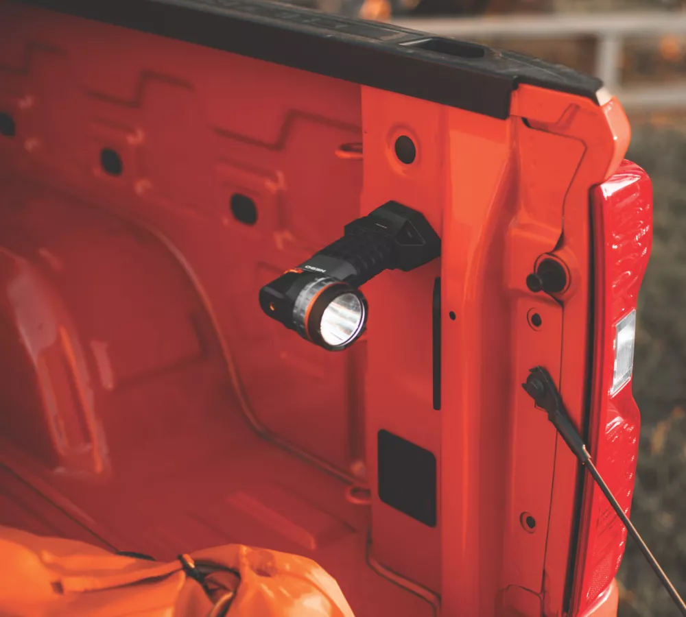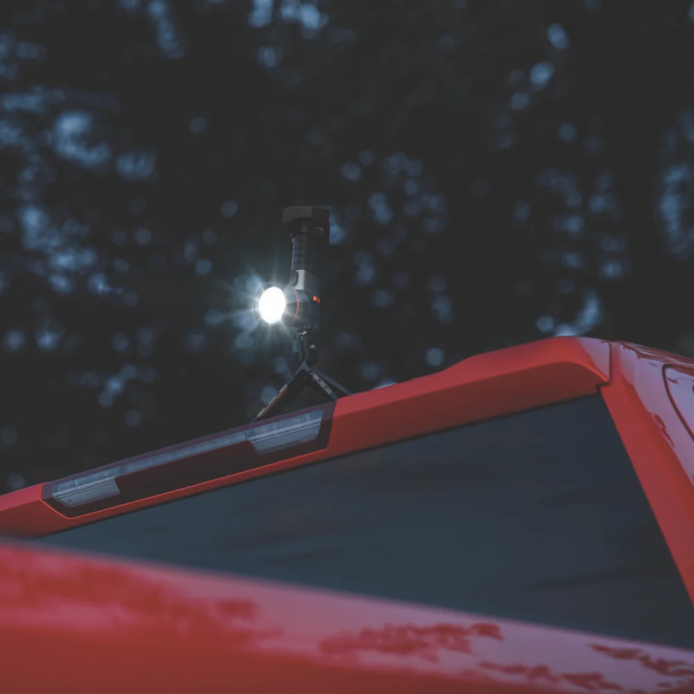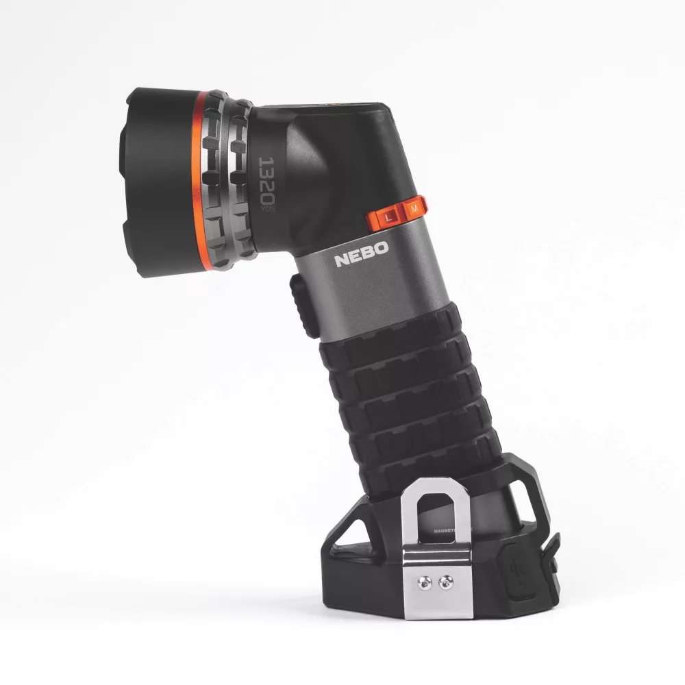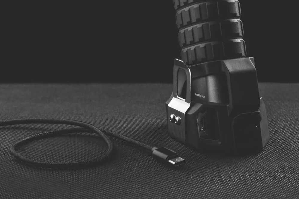 Compact and durable rechargeable spotlight with ergonomic, comfortable design. Integrated magnetic base, belt clip, tripod mount and carry lanyard. Features reflector design and is ideal for outdoor use, with ultra-long beam distance and a useful flood pattern at close range. Easy mode selection using dial with separate buttons for activation. Manufactured from anodised, aircraft-grade aluminium.