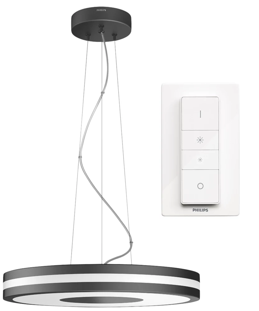Thin circles of aluminium cast warm-to-cool white light in 3 directions. Offers instant control via Hue dimmer switch (included) or Bluetooth. Hands-free voice control can also be set up. Add a Hue Bridge (sold separately) for additional features.