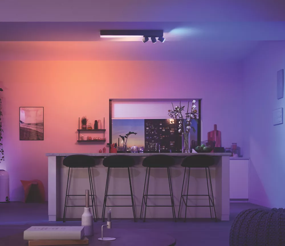 Contemporary, fixed ceiling light with aluminium body, thermoplastic diffuser and 3 spotlights that can be angled individually. Set each light in the fixture to your preferred colour choice from an extensive range available. Control via the Philips Hue app.