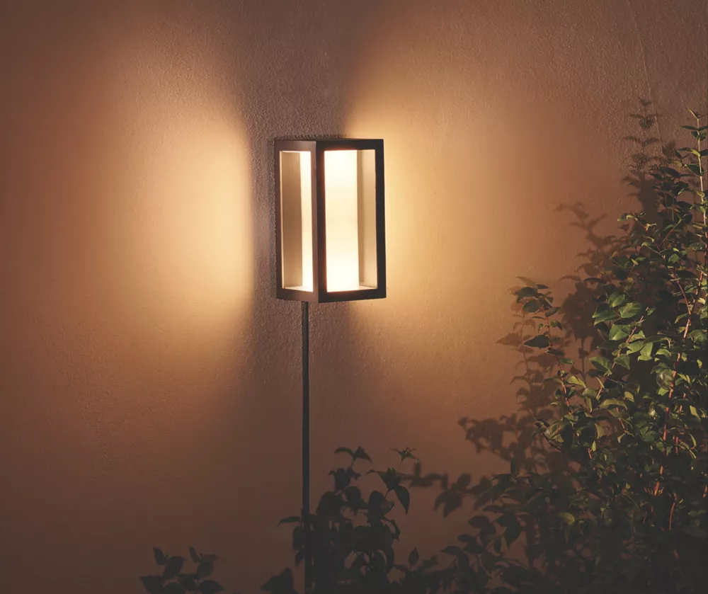 Modern glass-enclosed fixture. Needs only a wall socket to give dusk-til-dawn light in any of 16 million colours. Unlock more with the Philips Hue Bridge (sold separately).