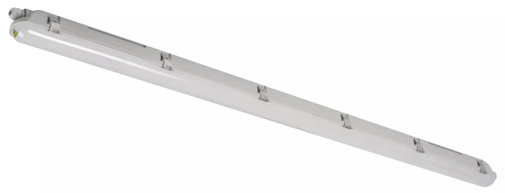 Robust and waterproof luminaire that can be deployed in a wide variety of locations. Supplied with ceiling-mounted brackets and suspension hooks.