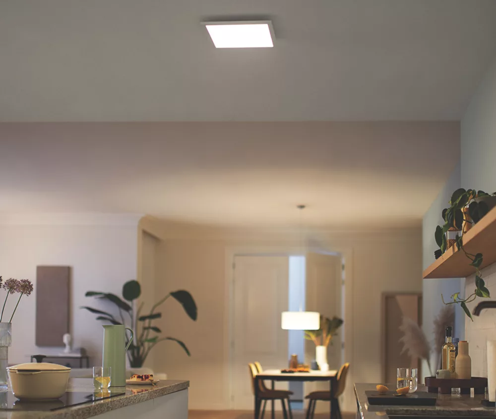 Slim LED panel offering uniform light distribution and easy change of light setting with existing switch. No dimmer or additional installation required. Ideal for low-ceiling rooms, sitting flush against the surface. Easy to clean.
