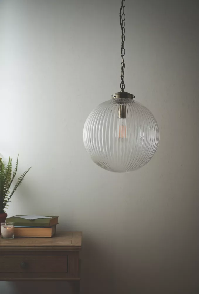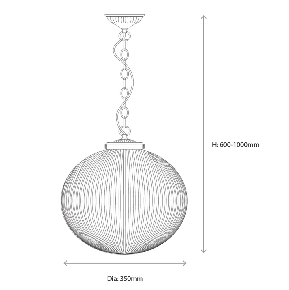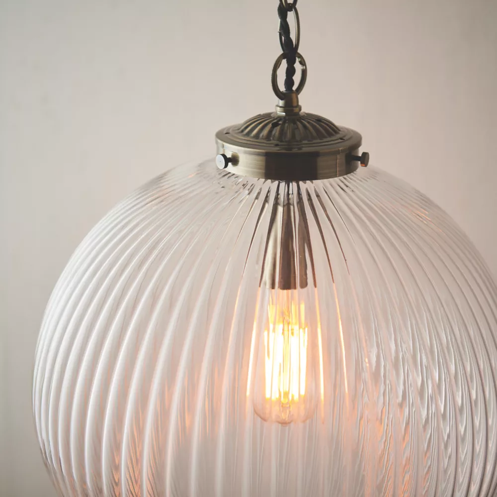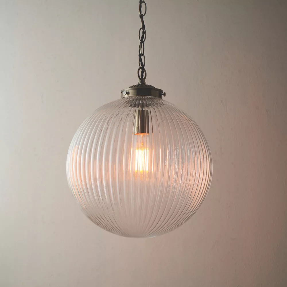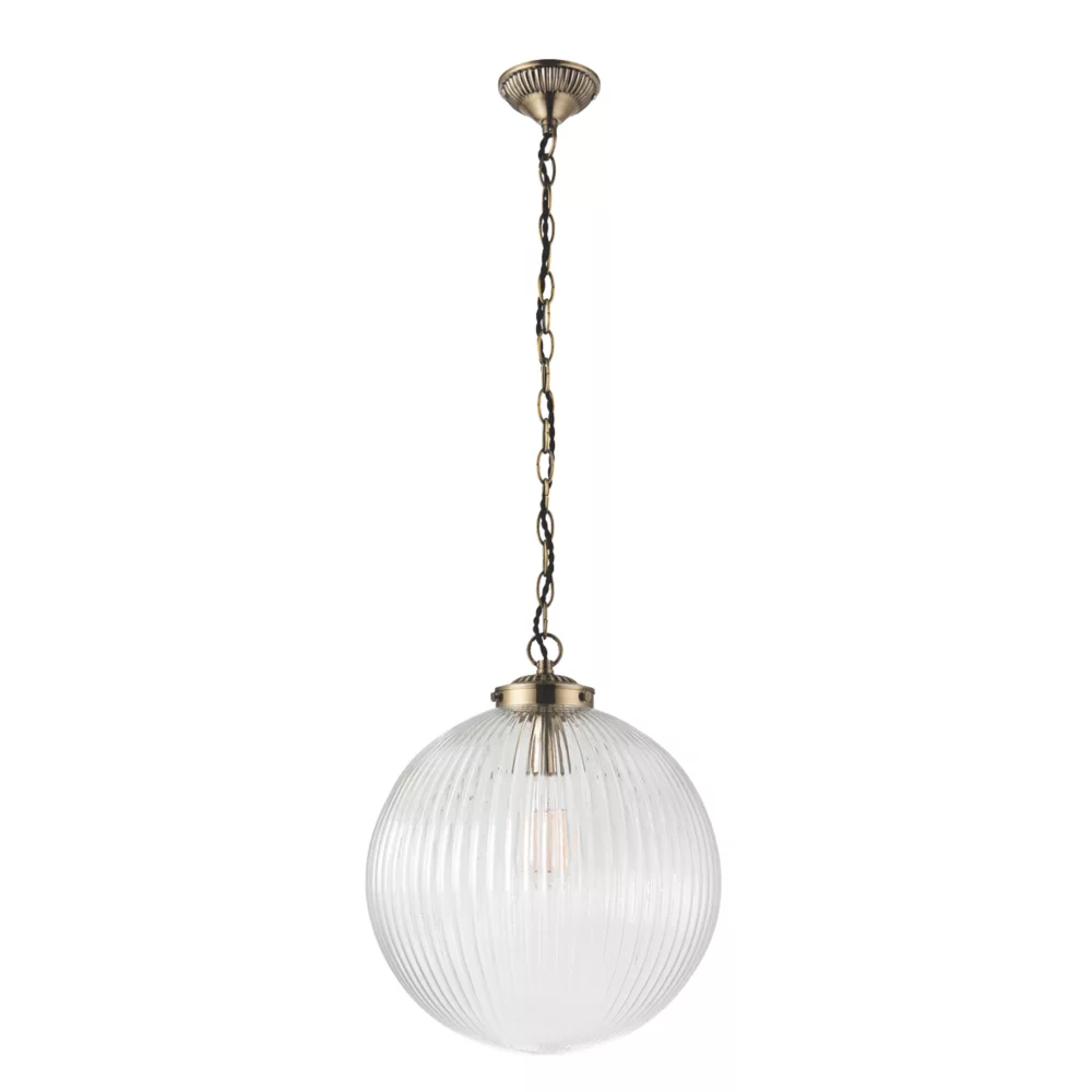 Round glass shade with ribbed design, suspended from decorative chain in antique brass finish.