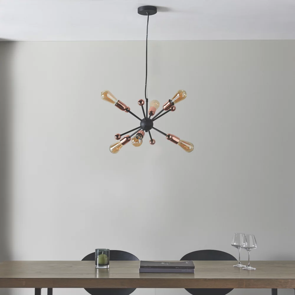 Industrial style. Adjustable multi-arm pendant with six lights, suspended from a matt black plate.