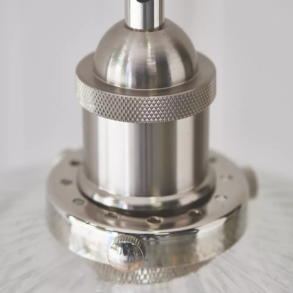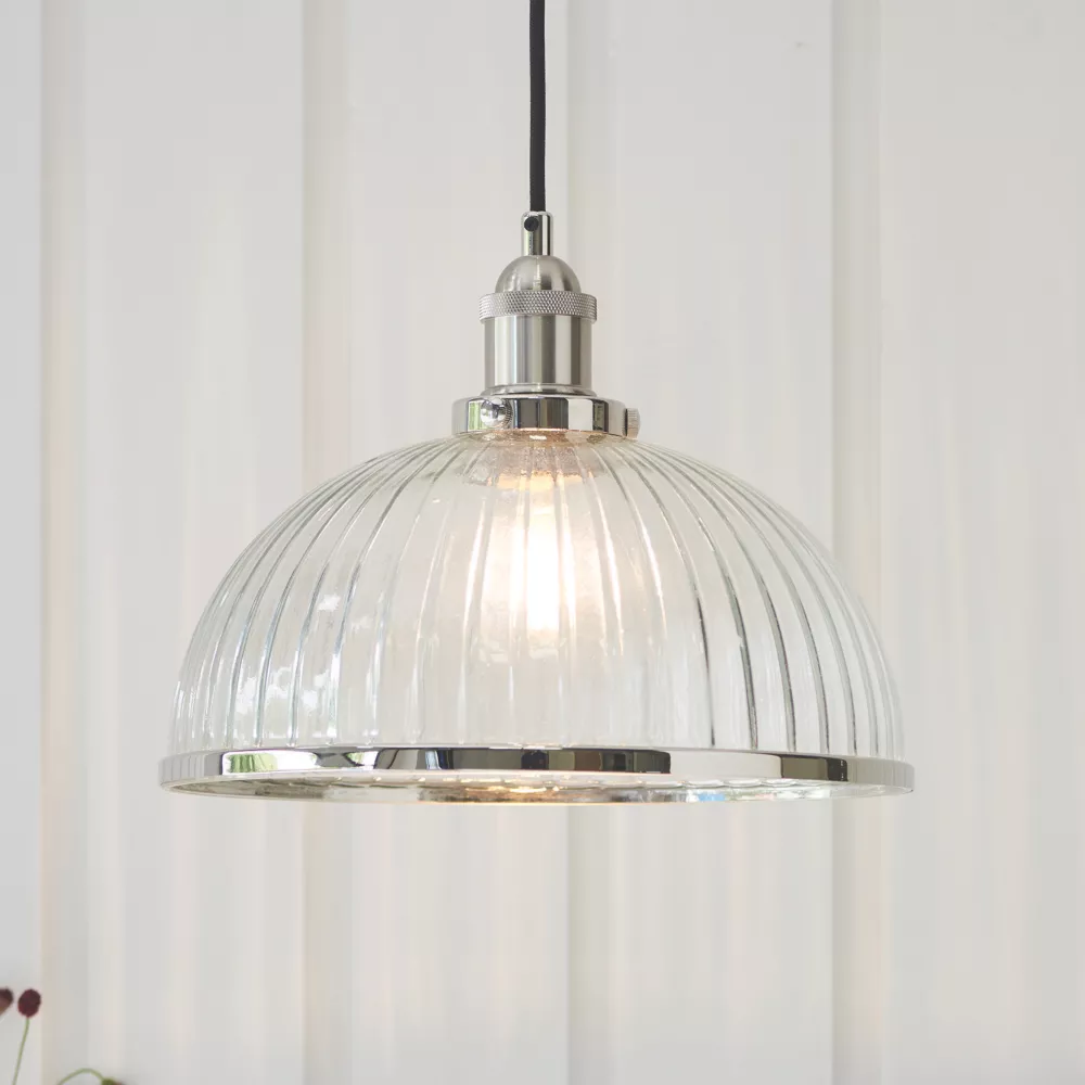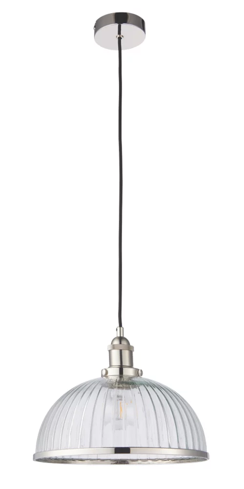 Industrial style. Clear glass shade with ribbed design, finished in bright nickel plate with knurled lamp holder detail. Suspended from height adjustable black fabric flex.