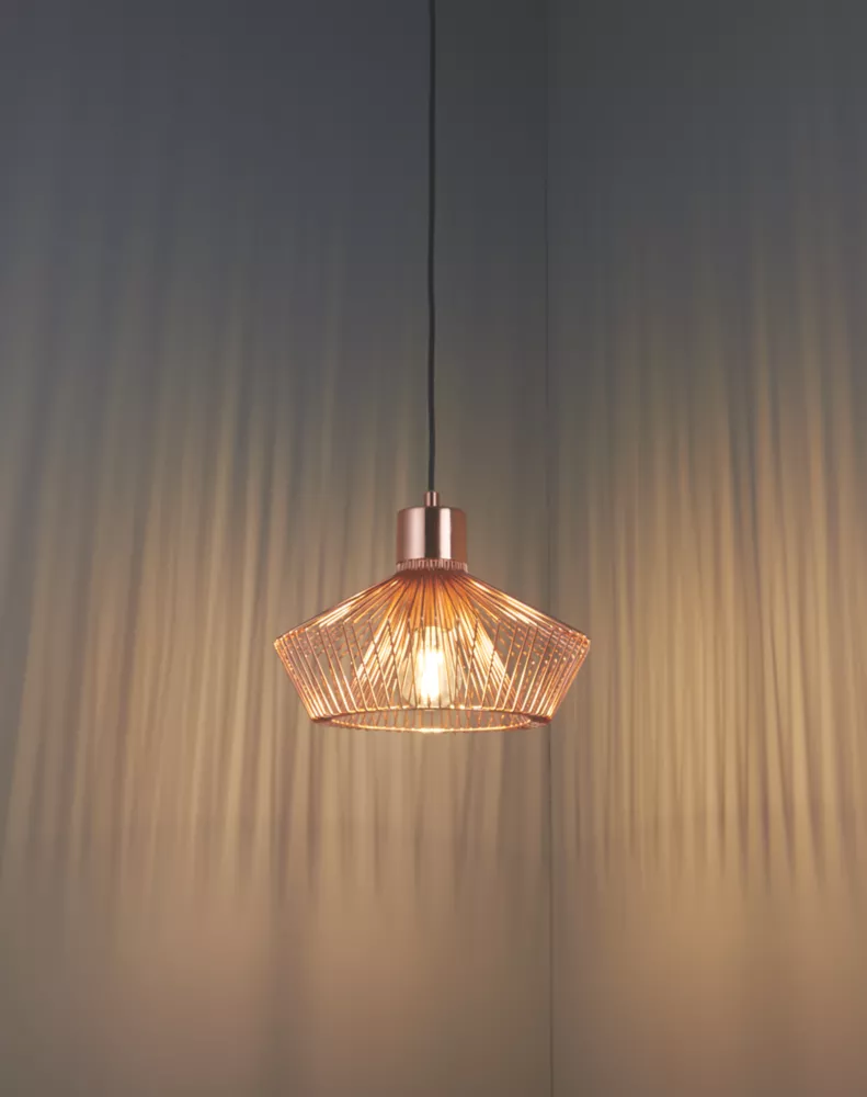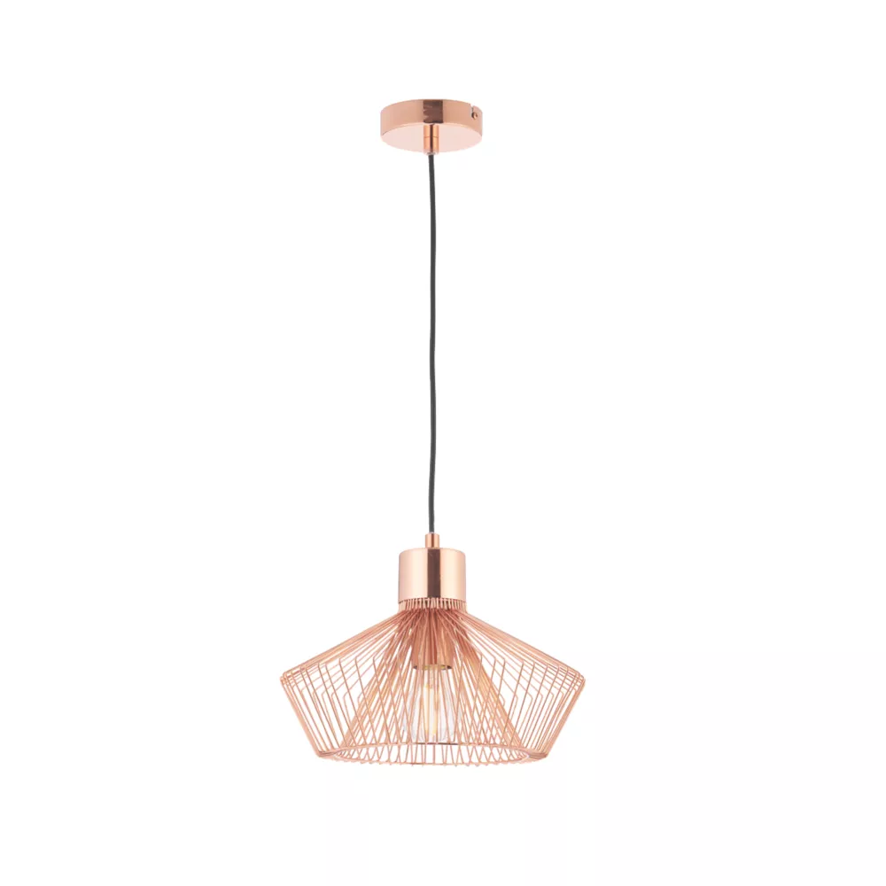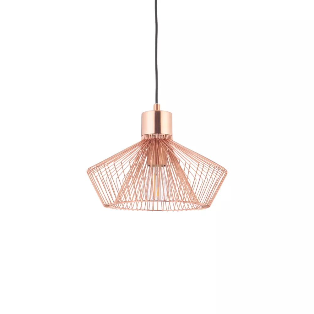 Industrial style metal frame cage pendant, finished in polished copper plate. Creates interesting light pattern.