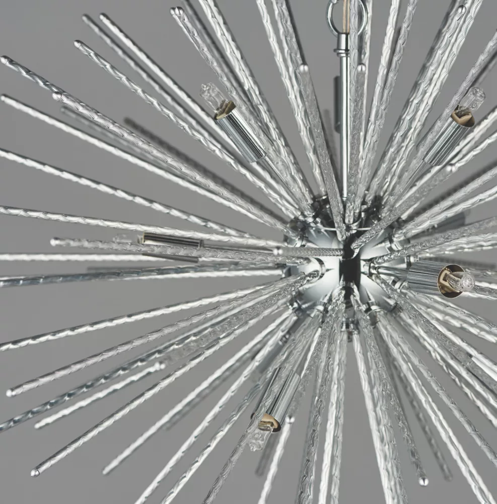 Suspended from height-adjustable chain with clear flex. 9 lights scattered among textured rods.