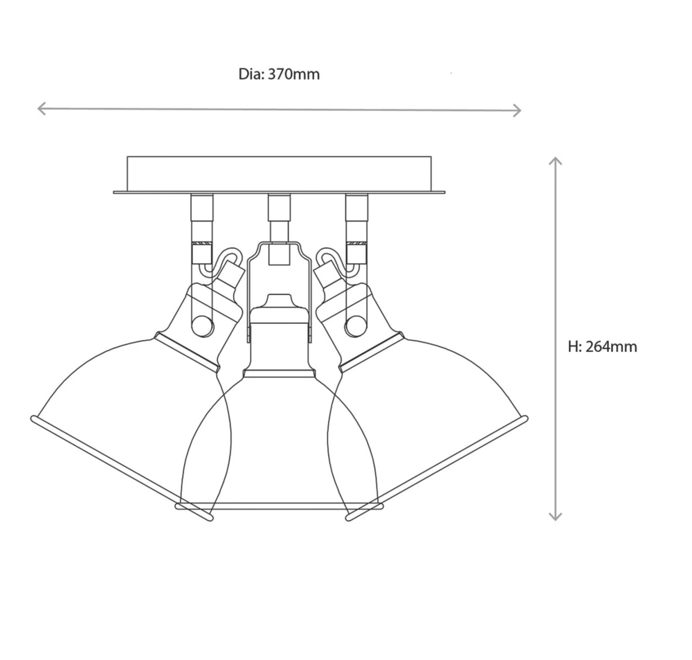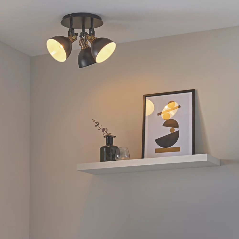 Industrial modern matt black and gold 3-light spotlight with adjustable heads. Metal shade provides directional task lighting. Compatible with LED lamps. Dimmable when fitted with dimmable bulbs.