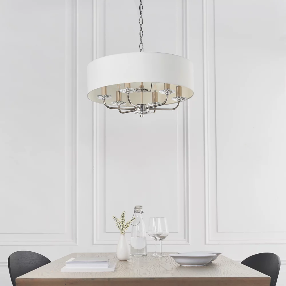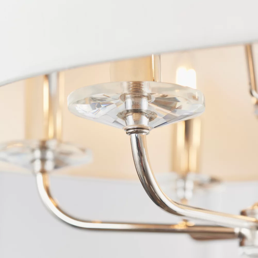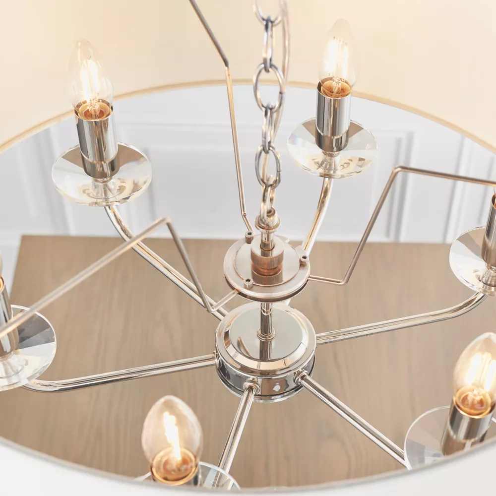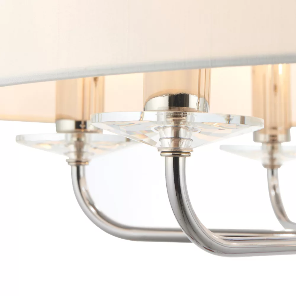 Bright nickel plated arms with crystal detailing. Fitting includes narrow, faux silk shade in vintage white colour.