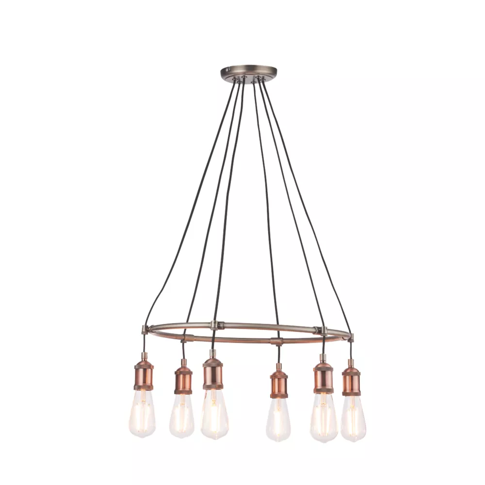 Industrial style. Suspended from black fabric flex with knurled lamp holder details. Aged copper and aged pewter finish.