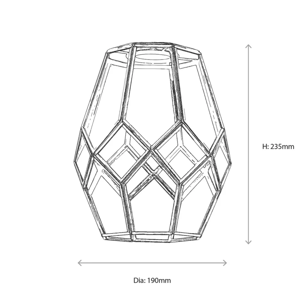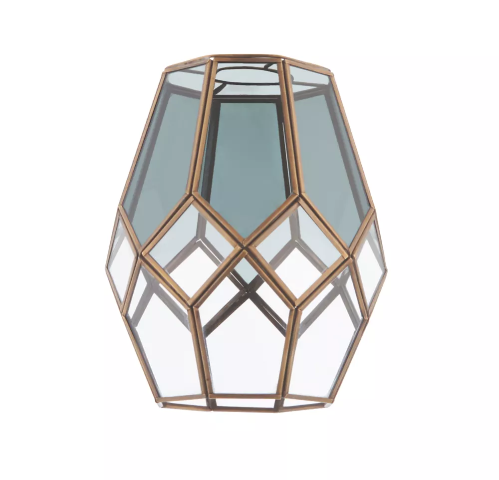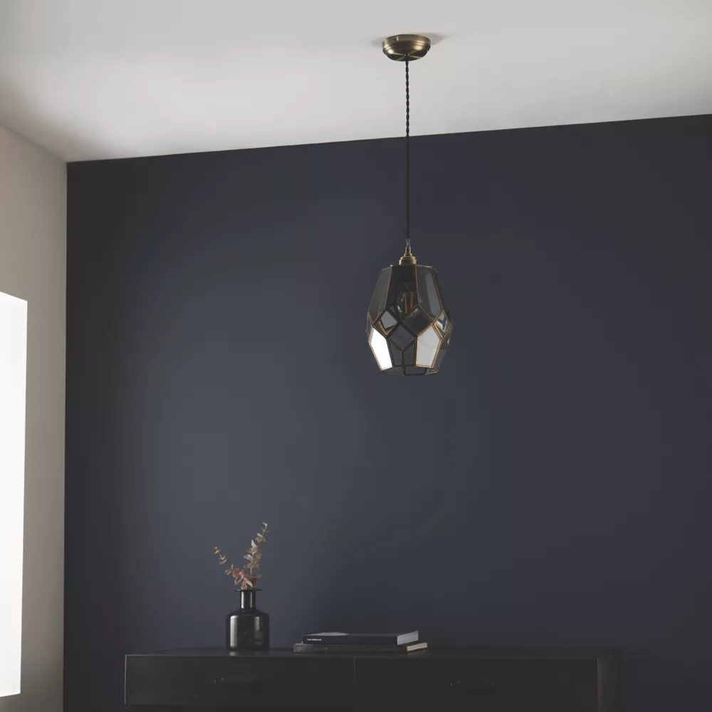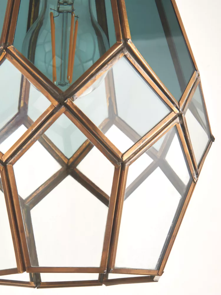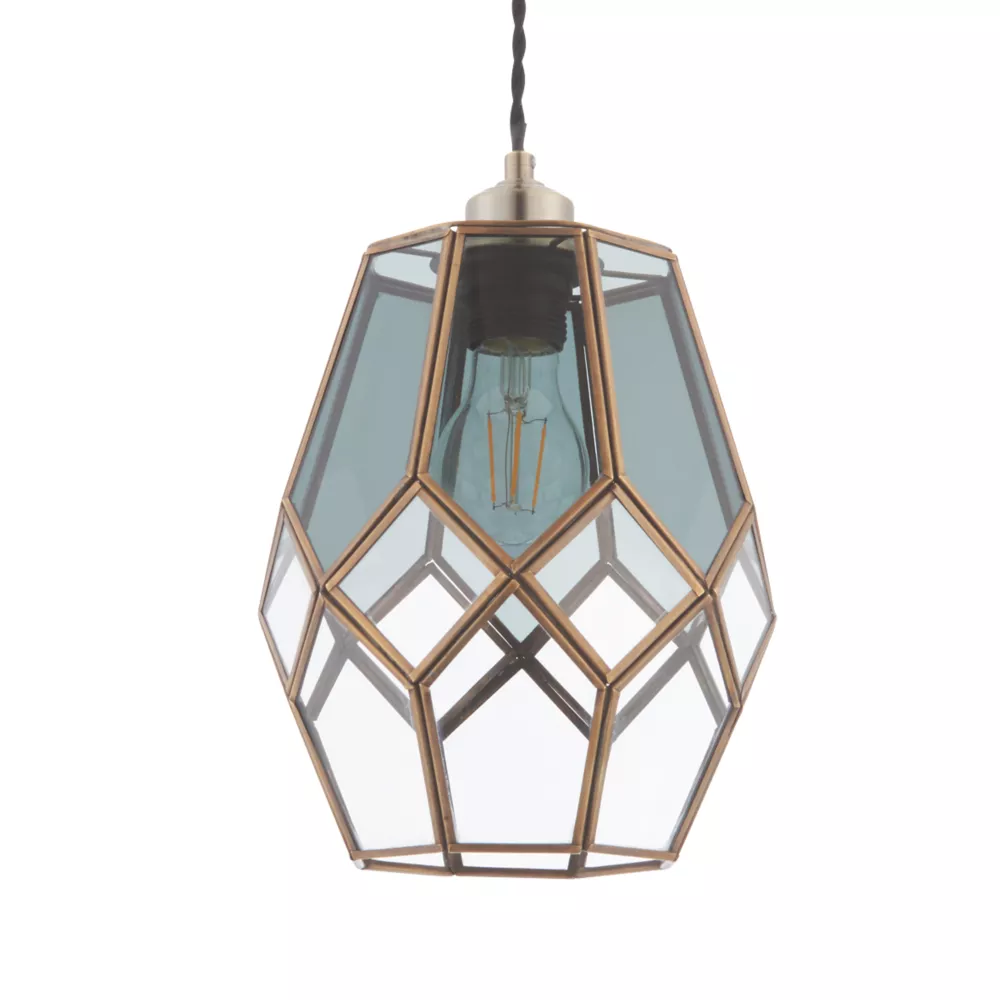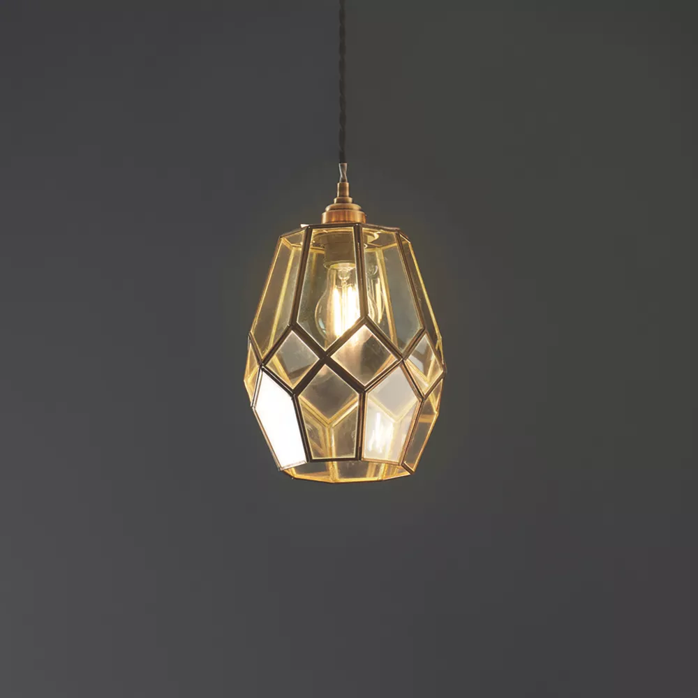 Non-electric cage pendant for use with a cable set. Clear and grey glass panels with antique brass effect metal trim.