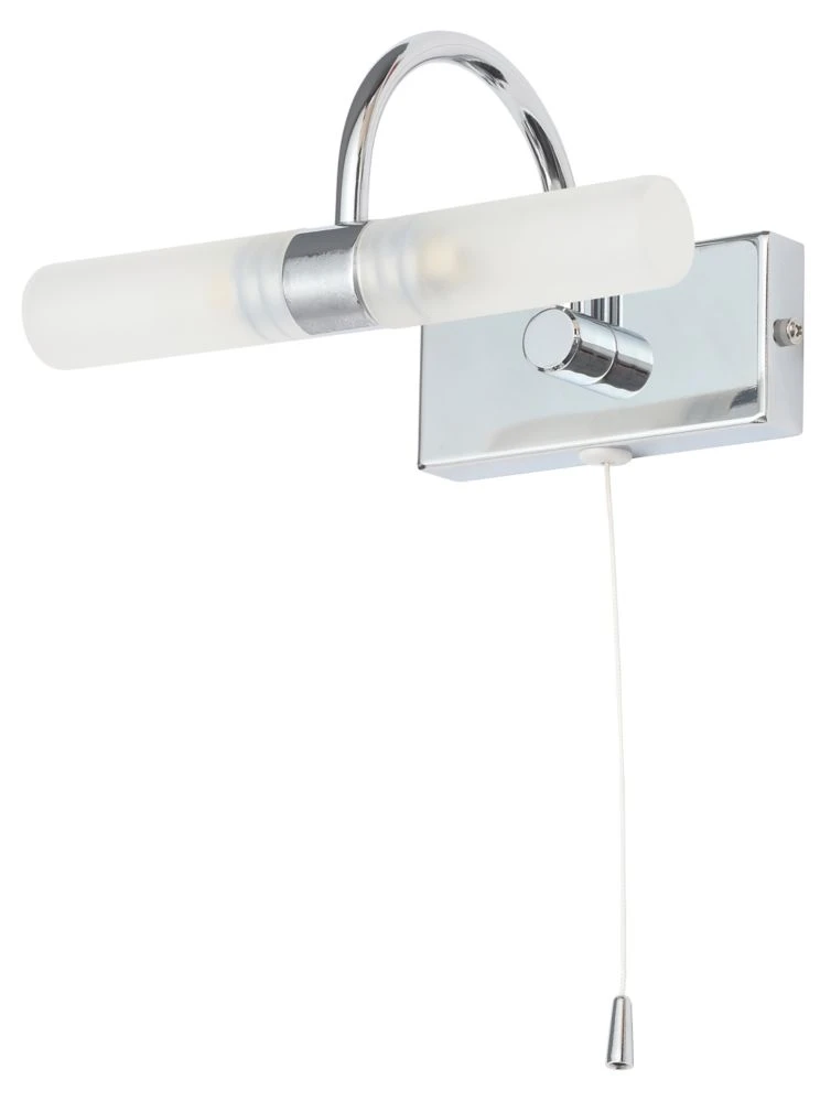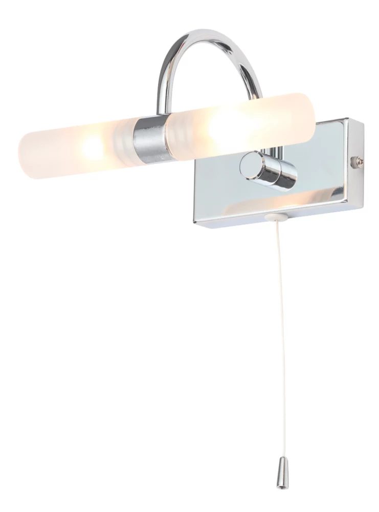 Modern chrome finish wall light with opal glass and a pull switch. Ideal for above a bathroom mirror.